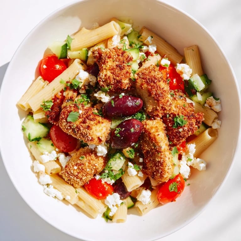Save to Pinterest My aunt Lena introduced me to this dish during a sweltering July afternoon when her kitchen smelled like garlic and sunshine. We stood over her massive wooden cutting board, chopping tomatoes and cucumbers while she explained that Greek cooking is about letting ingredients shine without overthinking them. That day, I learned how the crunch of perfectly fried chicken can transform a simple pasta salad into something people talk about weeks later.