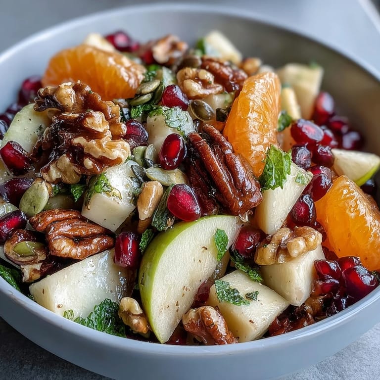 Save to Pinterest One November afternoon, I was rummaging through my refrigerator when a pomegranate caught my eye—ruby red and promising. I'd bought it days earlier with vague intentions, and suddenly I understood why: it needed to become this salad. The moment those seeds hit the bowl alongside crisp apple and orange segments, something clicked. This isn't just a dish; it's what happens when you stop overthinking and let the season guide you.